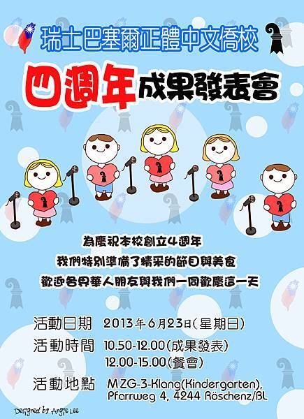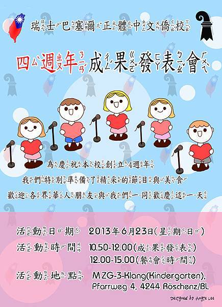 若有興趣參加四週年成果發表會的朋友,請至Doodle報名。或至學校特別成立的Facebook活動網頁。或至學校專屬的Facebook上詢問相關問題或發表留言。誠摯歡迎!